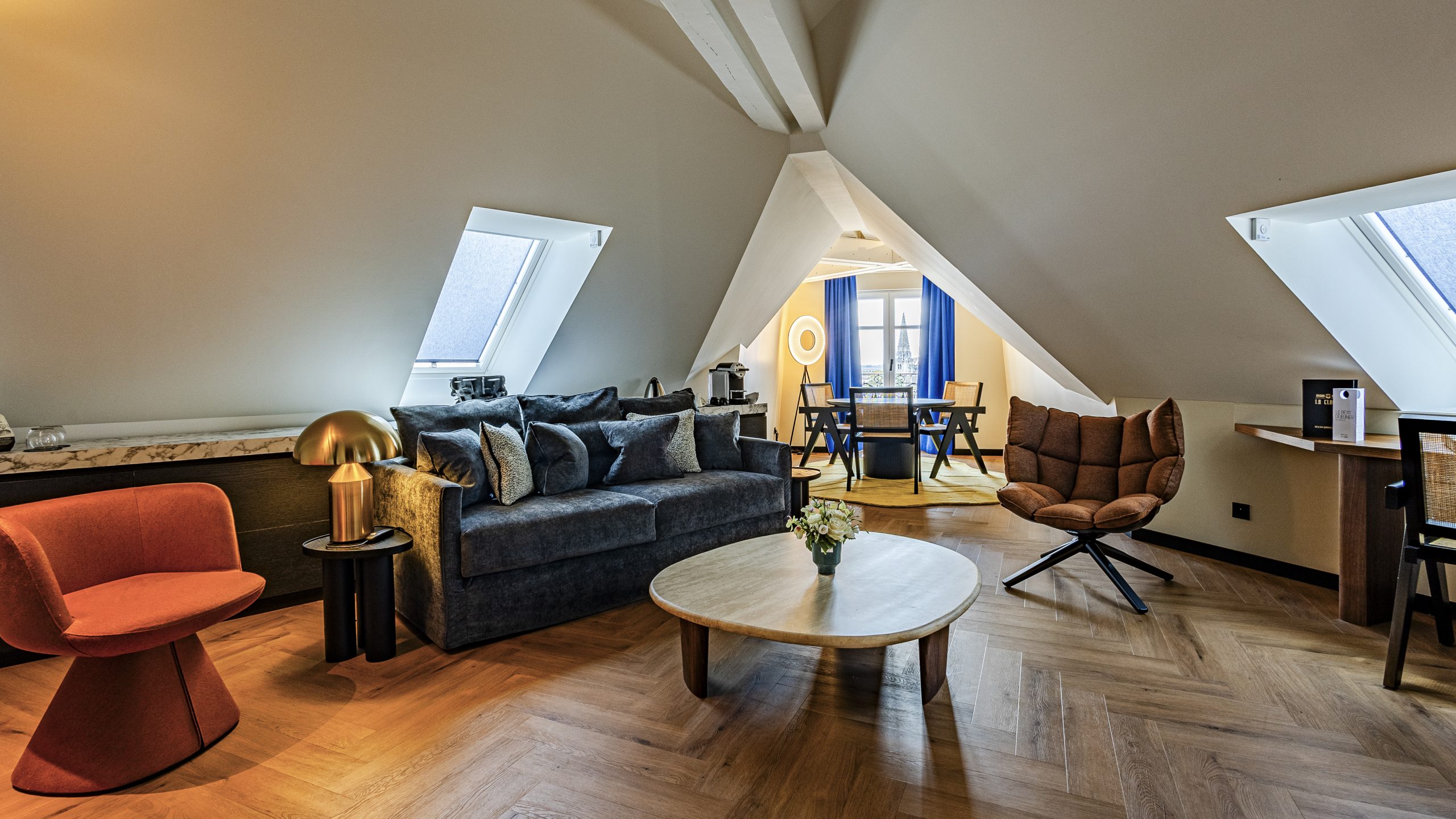 Dans nos suites, chaque détail vise à vous offrir une parenthèse hors du temps : volumes généreux, boiseries chaleureuses et tissus soigneusement sélectionnés. Que vous soyez en quête d’un refuge intime ou d’un espace à vivre spacieux, vous trouverez ici l’adresse parfaite pour prolonger votre séjour à Dijon.